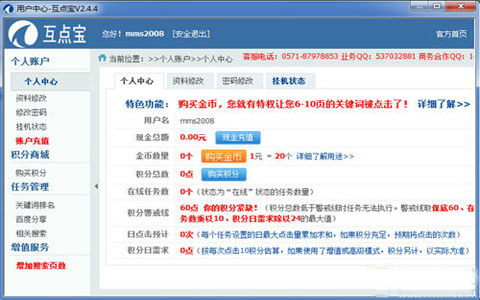4、登录用户中心(网址管理模块),将你的任务加进去并上线,否则,挂机提示“先发任务”,得不到积分哦。
