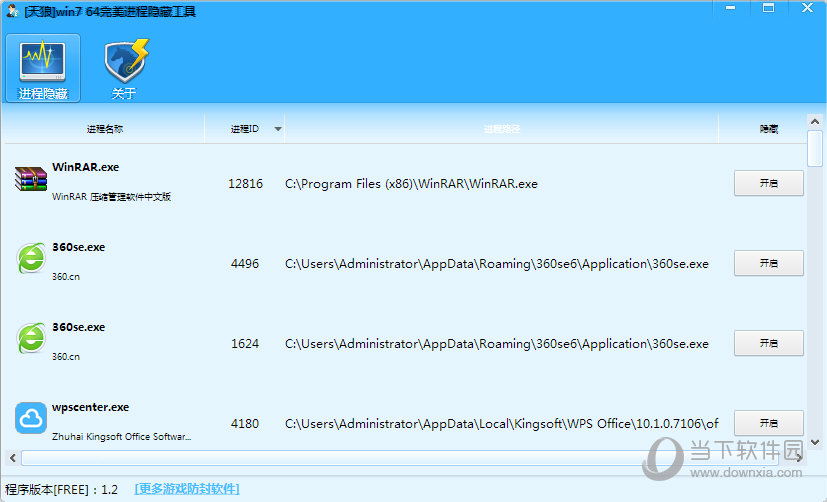 2、选择需要隐藏的软件进程,点击“开启”使用隐藏功能