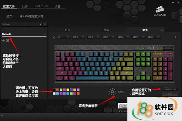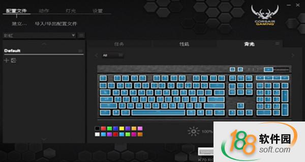 3、成功安装海盗船k70rgb键盘后,用户可以对键盘进行各种参数设置,包括背光及按键设置等。
