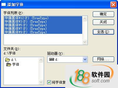 2、然后在弹出的窗口中选择你刚刚新建的“字体”文件夹所在的盘,双击文件夹,文件夹里面的字体就会显示在字体列表中,选中要安装的字体点击确定,字体就安装好了。