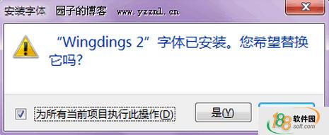 在操作中会发现 Windows 7 在安装字体时比 XP 系统方便了很多,比如在安装字体时遇到已经安装或者字体损坏的情况时,会弹出如下图窗口提示: