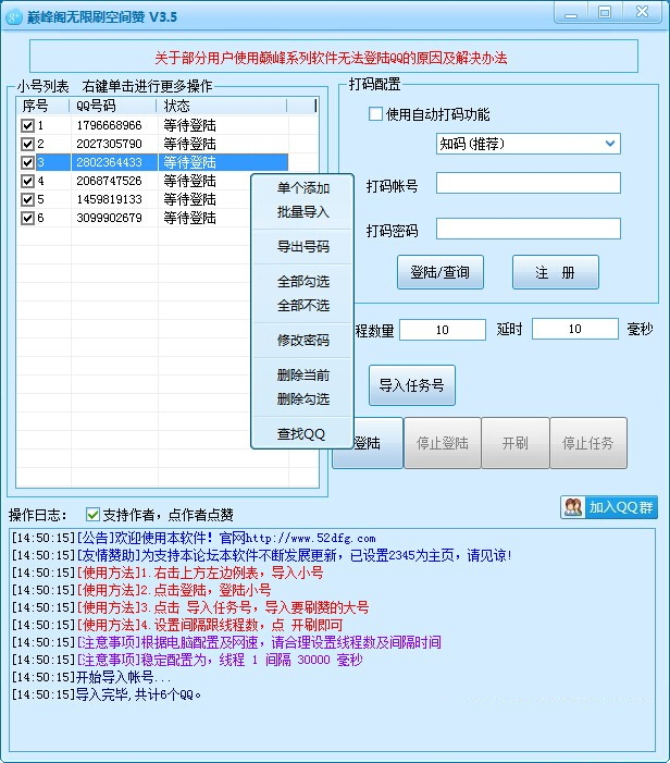巅峰阁无限刷空间赞软件是一款由巅峰阁社区推出的QQ空间自动刷赞工具。巅峰阁无限刷空间赞软件功能强大,使用方便,能帮助用户一键快速刷空间赞,让空间人气一路飙升,让你成为朋友中的人气之王,需要的朋友快来下载吧。