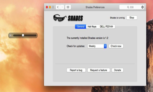 Shades Mac版是一款Mac OS平台上的小巧的屏幕亮度调节软件,它被安装在Pre pane里,虽说没有f.lux那样智能,但却提供了手动调节的Menu Control 和 Slider Control,而且支持热键控制。