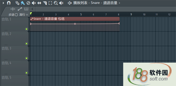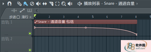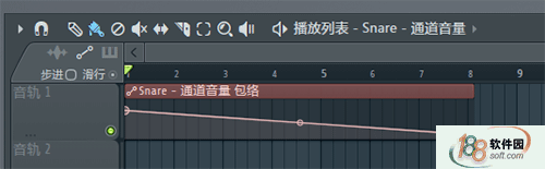 4、上图中显示的是通道音量自动控制剪辑,上面的包络线是通道音量包络线,它一直是水平状态,在时间经过的过程中音量保持不变。把右边的节点拖动到最低端使其呈现左高右低的斜线状,那么在这段自动控制剪辑持续时间内音量将由高到低,如下图所示: