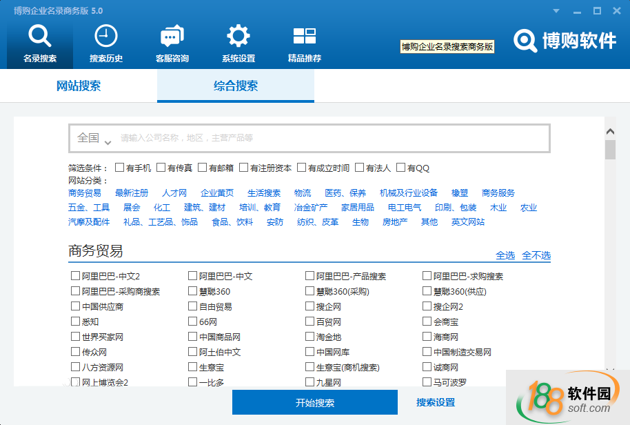 博购企业名录搜索软件商务版是一款找客户的营销工具,可以快速准确的从收录的600多大型的商务和行业网站,帮助大家快速,准确的从收录的网站中实时搜索到最新的公司信息。博购企业名录搜索软件商务版支持 3000多个县级市和7000多个行业的选择,是销售人员找客户的好帮手。