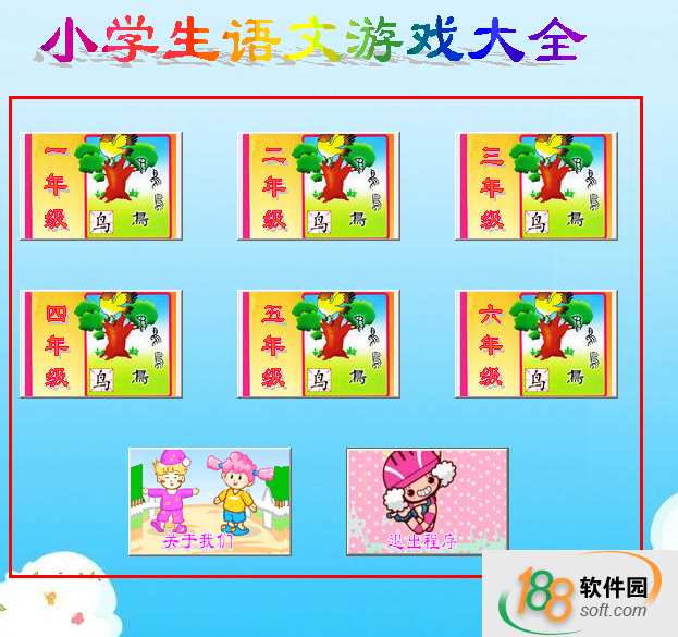 软件分为的一年级语文游戏、二年级语文游戏、三年级语文游戏、四年级语文游戏、五年级语文游戏、六年级语文游戏等六个模块。
