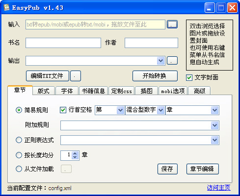 EasyPub是一款功能强大的TXT转EPUB转换器,可以将txt文本转换成epub或是mobi,也可以将epub转换成txt或者mobi。使用非常简单,章节、版式、字体、书籍信息、css样式、插图可以很方便的制作和转换epub或mobi电子阅读书籍。