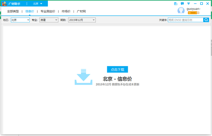 请先关闭计价软件,打开桌面的广材助手,选择地区,月份就可以点击立即下载。