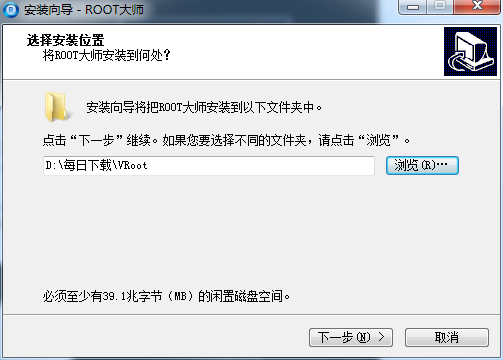 1、在188下载网将安卓大师一键root下载下来,并解压到当前文件夹中,点击其中的VRoot_1.8.8.20396_Setup.exe应用程序,进入安装向导界面,选择软件安装位置界面,188下载网小编建议用户们安装在D盘中,选择好安装位置点击下一步。
