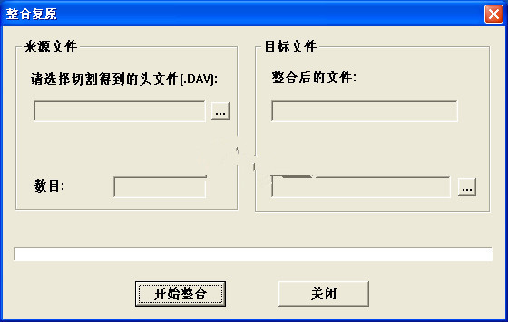 合并也是非常简单,我们在把文件分割完成后,会产生一个DAV格式的头文件以及我们分割成的小文件,我们只需在菜单中选择整合复原,然后选择那个dav头文件,按“开始整合”按钮就可自动进行合并了。