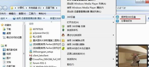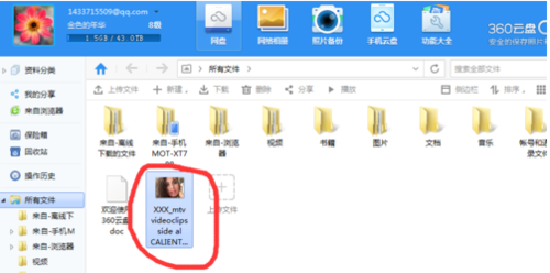 第六步,点击红圈里面的加号,就可以上传文件到云盘了,这里的文件包括,视频,图片,文件夹。点击一下加号就到了你在电脑上的个人文件夹了,在里面选择需要上传的文件,这里我以视频文件为例,来演示,在该文件上右键,如图:选择保存到360云盘。就开始上传了