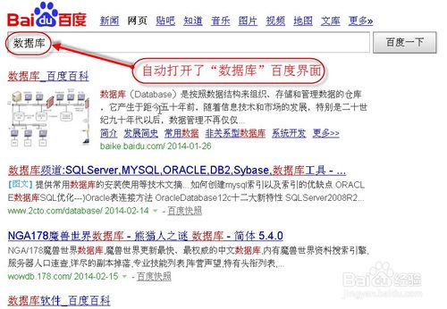 输入法自动打开IE浏览器,显示出“数据库”关键字的百度搜索结果
