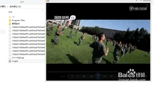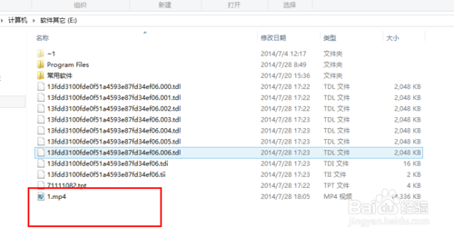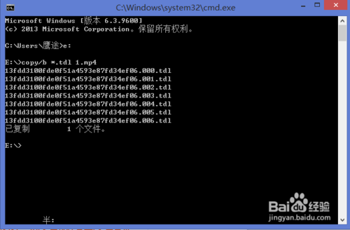7、然后输入:copy/b*.tdl1.mp4对E盘下所有tdl格式的文件进行合并。然后你就会看到E盘下有个1.mp4的视频了。