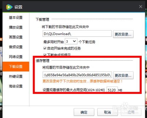 4、在设置中选择下载设置,查看如下图所示的视频播放缓存记录存储位置,并通过电脑找到此目录。