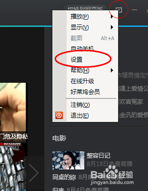 3、在客户端界面右上角,点击向下箭头按钮,弹出如下图中所示的菜单,然后点击设置选项。
