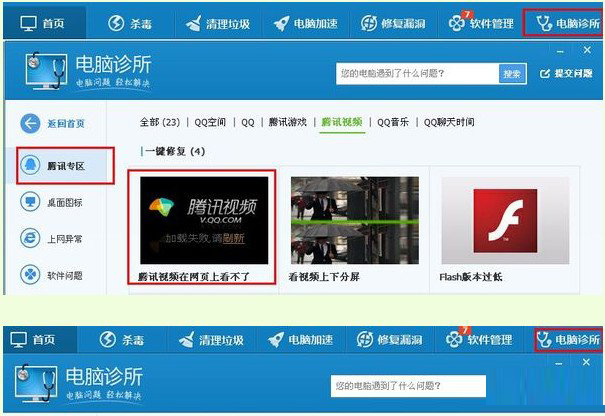 第三步:如果还是不是的话,你再打开腾讯管家,找到电脑诊断,然后在找到“腾讯专区”---找到“上网异常”,点击“一键修复”,修复下应该就可以看了哦!