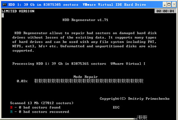 而HDD Regenerator通过将磁性逆转来使坏道再生。如果您的硬盘有坏道,不仅影响使用,而且还有可能造成所存储的信息丢失,HDDR将使您的硬盘得到再生(差不多60%的受损硬盘是可以修复的)。结果是,不可读取的受损信息被修复,现有的信息不会受到影响。
