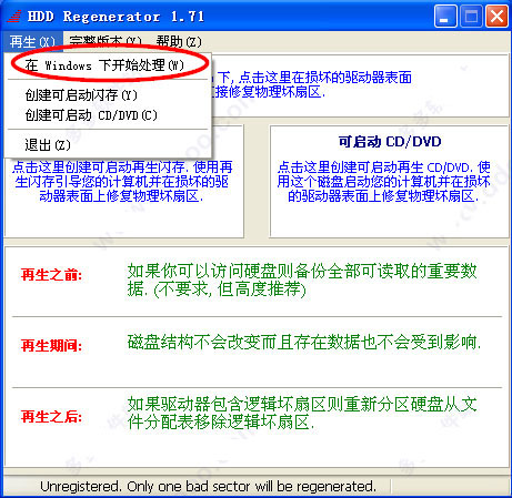 1、下载软件压缩包文件,点击“HDD Regenerator.exe”即可运行程序,首先点击“再生”—“在windows下开始处理”选项,如下图所示: