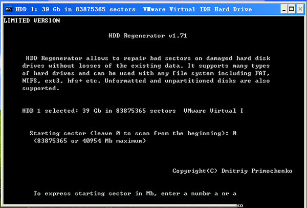 打开硬盘再生器后就可以开始修复,建立修复引导软盘。如果您使用的是非注册版本,您就只能修复找到的第一个坏道。未注册的演示版本的主要目的是显示出已注册完整版能够修复的坏道信息,这个信息在修复过程结束后会显示在屏幕上,注册版会仔细地检测硬盘盘面并且修复所有找到的坏道。