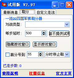 一流QQ四国军棋刷分器 V2.97 (2010-3-24) 改进:最小化窗口也能正常刷分,这样可以节省不少资源!推荐更新。