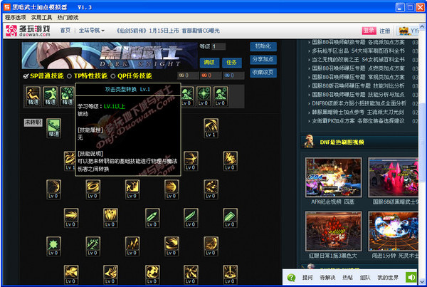 dnf黑暗武士技能加点模拟器,这是多玩网页上的一个模拟加点页面,小编为了图方便给弄成了一个桌面版,送给需要经常使用到模拟加点的朋友!