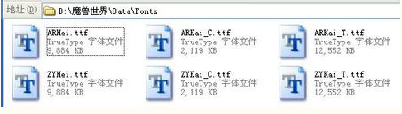 在wow文件夹里设置font文件夹,里面的字体如下设置: 状态栏、生命条、经验条上显示的英文和数字字体--ZYKai_T.TTF 战斗时的伤害数值提示文字--ZYKai_C.TTF 任务说明和书信、石碑的正文字体--ZYKai_T.TTF 按钮和登陆画面及人物、物品、装备、技能等标题上的主要字体-- ZYKai_T.TTF. 物品、技能的说明字体--ZYHei.TTF 聊天字体--ZYKai_T.TTF 4.3.2以后还是可以手动修改的,把字体文件名里的ZY改成AR就好,其他不变
