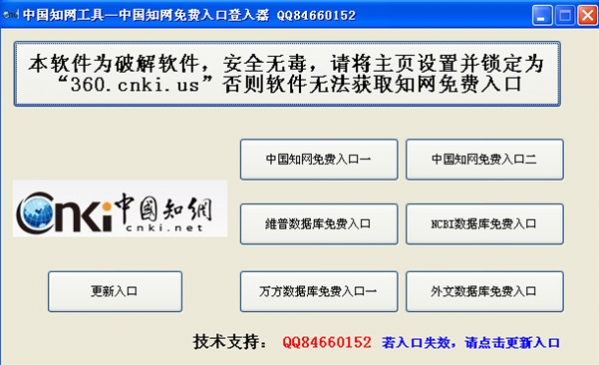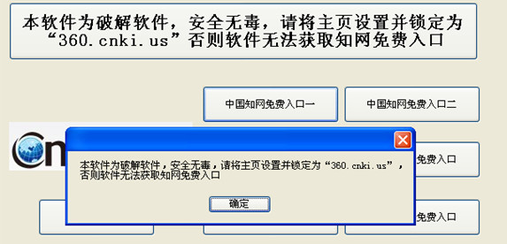 8、点击“中国知网免费入口一”进行使用,如果总是弹出提示框,是因为您的电脑中360安全卫士或者QQ电脑管家已经把您电脑中的浏览器主页锁定了。你必须手动地把您最常用浏览器及IE浏览器的首页地址设置为“360.cnki.us”否则软件无法获取免费入口。
