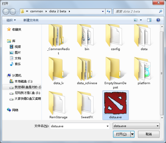 找到本机的dota2文件夹 steam客户端:steamSteamAppscommondota 2 beta 国服客户端:dota 2SteamAppscommondota 2 beta 选择dota.exe