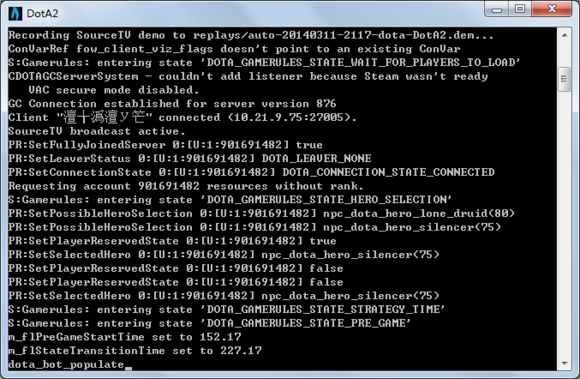 至于新增的录像功能简单说明下: 只要建服dota2betadotareplays文件夹下就会产生一个以auto为前缀的录像文件,和从网上下载的录像格式相同(*.dem),观看录像需要将录像移动到replays的上层目录dota文件夹中,重命名成一个简单的名字(例如“1.dem”)。然后启动游戏控制台输入如下指令: “playdemo 1.dem” 稍等片刻,录像文件就会成功播放了
