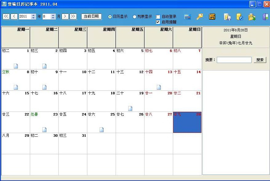普瑞日历记事本用于录入日记,工作计划,收支流水帐等,日历型界面,带自动提醒功能,操作简便!可管理日程,时间,备忘录,计划,收支记帐等!