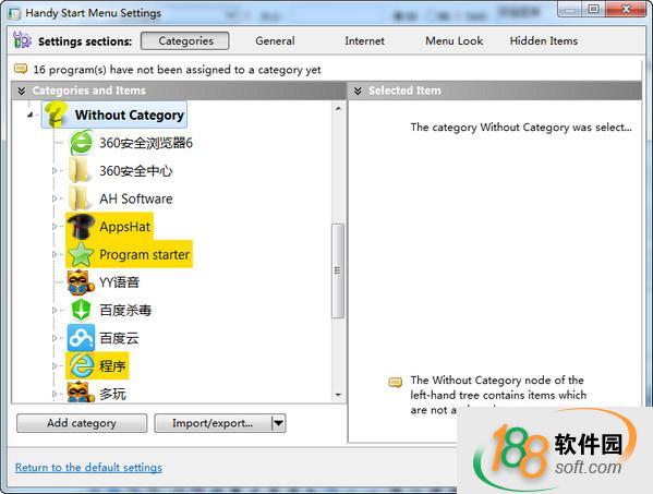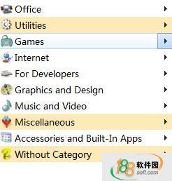 默认情况下,分类有9项,包括:办公软件、通用软件、游戏、互联网、图画和设计、安全、音频和视频、windows内置程序、其他。 已经安装的软件菜单项,这个软件会自动判断它属于哪个分类哦,这点是基于其他用户上传的数据而得出的。